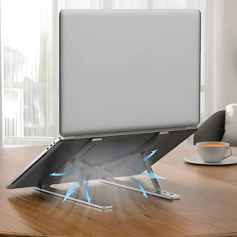 7 Adjustable Levels Laptop Stand. Stand laptop dengan tujuh tingkat ketinggian yang dapat disesuaikan, terbuat dari aluminium alloy yang kokoh dan ringan. Membantu mengurangi ketegangan pada leher dan meningkatkan ventilasi laptop.