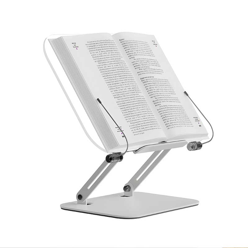 Acrylic Book Holder. Penyangga buku transparan berbahan akrilik dengan tinggi yang dapat disesuaikan. Cocok untuk membaca buku dengan nyaman serta menjaga koleksi buku tetap berdiri tegak.