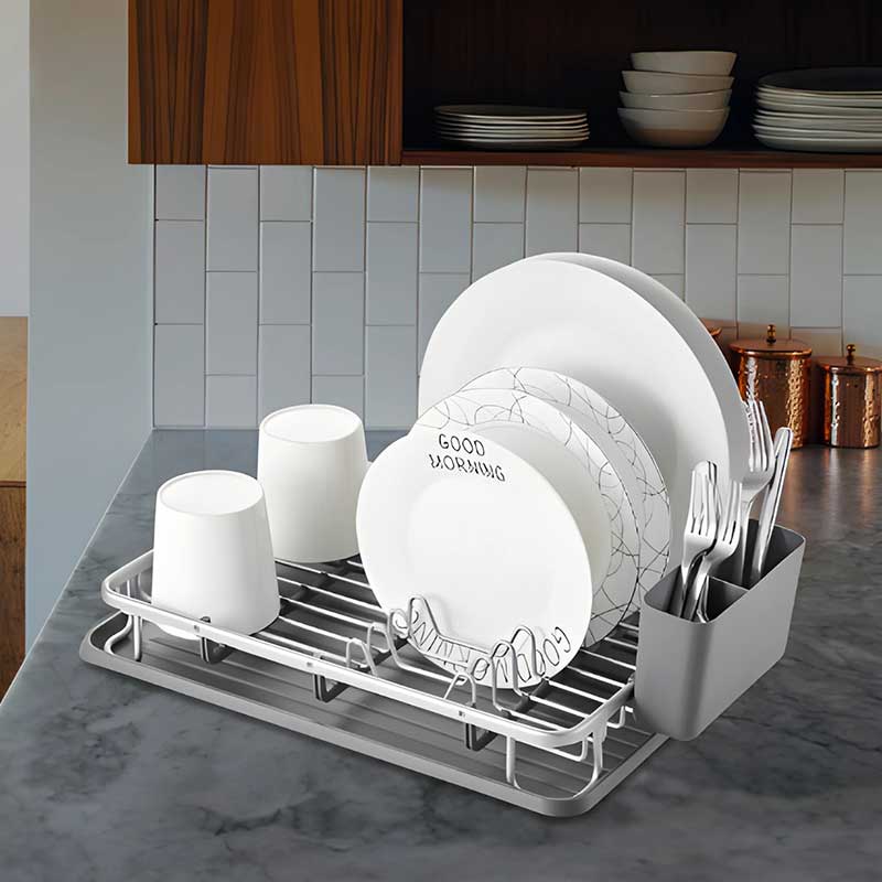 Drying Rack. Rak pengering piring yang dapat ditempatkan di atas bak cuci piring. Desainnya fleksibel dan dapat dilipat, memudahkan pengeringan piring tanpa memakan banyak tempat.
