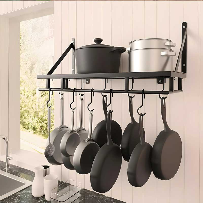 Hanging Pan Organizer. Rak gantung untuk menyimpan wajan dan panci agar lebih terorganisir dan menghemat ruang dapur. Dapat dipasang di dinding atau dalam lemari untuk akses yang lebih mudah.