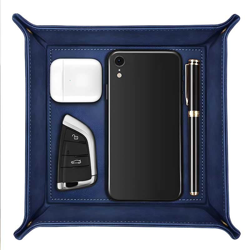 Valet Tray. Tempat penyimpanan aksesori pria berbahan kulit PU premium yang elegan dan tahan lama. Cocok untuk menyimpan kunci, dompet, jam tangan, dan barang kecil lainnya agar tetap rapi di meja kerja atau nakas.